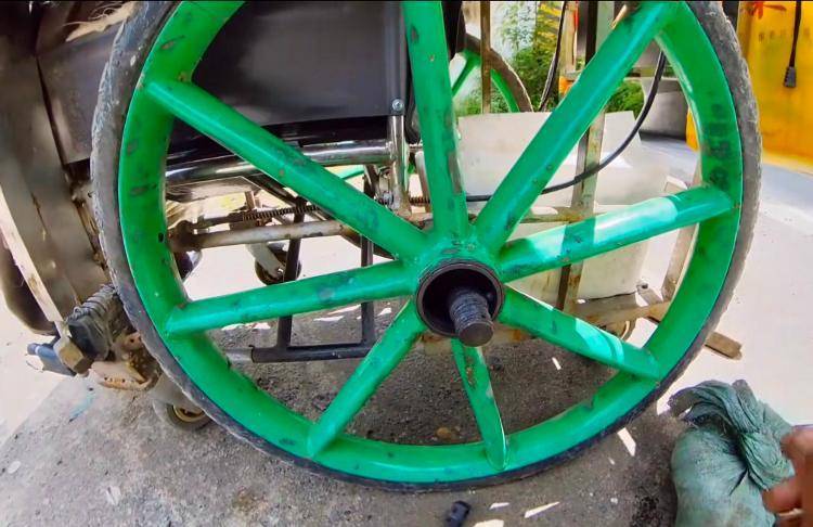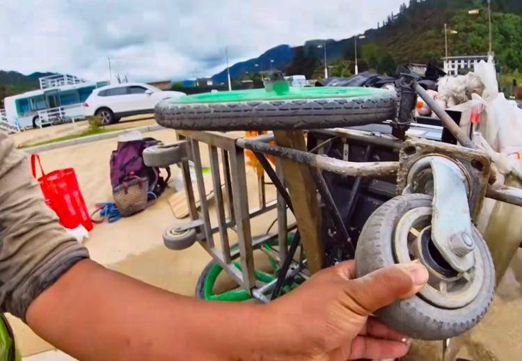 不止这些,“翻车”的状况会不时发生。“刚出发不久,我们去吃饭,停在门口的轮椅就滑下坡,翻倒了,还好妻子不在上面。快抵达日喀则的时候,推着推着轮子就掉了。”显然,地生已经习惯了这些意外,轮子不知换了多少次,轮椅不知修了多少次,总之,现在的“改造轮椅”比刚买的时候要结实很多。