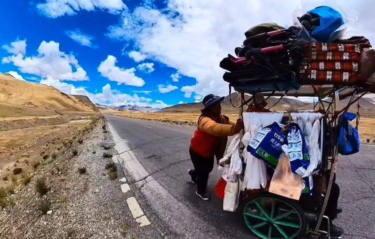 轮椅重达四五百斤,遇到连续上坡的山路时,地生最为吃力。“推着这么重的东西,又推着妻子,一直爬好几公里的山坡,走一点就要休息一次。加上有些地方海拔比较高,也有点缺氧。”地生说,大雨大雪还能披上雨衣挡一挡。“最害怕的就是沙尘暴,有点危险,要赶紧找地方躲起来。”