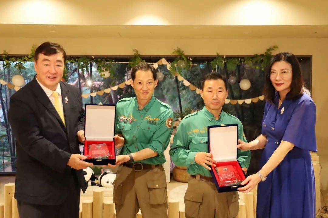 邢海明大使夫妇首先向被中韩两国粉丝们亲切称呼为“姜爷爷、宋爷爷”的两位韩方饲养员以及熊猫一家居住的爱宝乐园颁发了感谢牌。邢海明表示,在两位饲养员的专业照料与悉心关怀下,大熊猫爱宝、乐宝、福宝在韩国快乐成长,旅韩熊猫家族日益壮大,为中韩两国人民带来了无限欢乐与感动。前不久,爱宝乐园又诞生了两只大熊猫宝宝,希望“福宝”的两个“小妹妹”能够在饲养员的精心照顾下健康茁壮成长,给大家带来更多快乐。