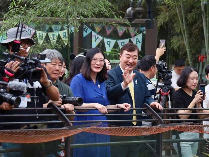 7月的爱宝乐园绿荫掩映、蝉鸣阵阵,旅韩大熊猫一家双喜临门,“爱宝”“乐宝”夫妇喜添双胞胎,在韩出生的首只大熊猫“福宝”也迎来了三岁生日。在此之际,邢海明大使和夫人谭育军女士前往三星爱宝乐园,和中韩两国民众及旅韩大熊猫一家共同分享盛夏的喜悦。