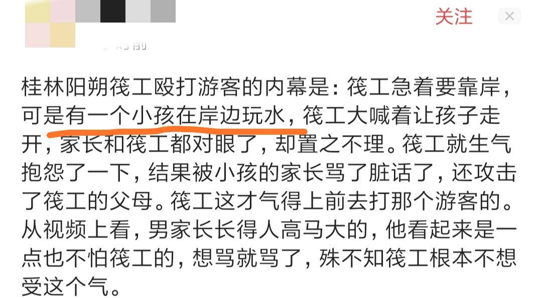 一个知情人爆料说,筏工打人当时他就在现场,知道事情的前因后果,整件事起因是由于游客在水边玩耍,筏工想要靠岸让游客让一下位置,但是游客没有听话,于是这争执就开始了。