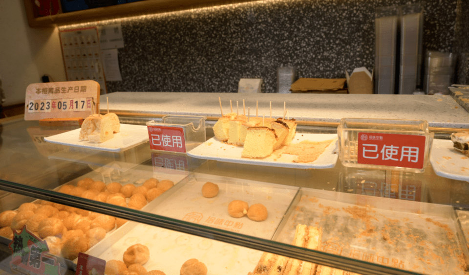 走进拾味中点文化东路店,产品销售柜里摆满了各式各样的糕点,柜上有商品生产日期备注,显示该柜子里的产品都是当天生产。在销售柜上还放置了供消费者试吃的糕点,每块点心都插上了牙签,糕点旁边还有已使用牙签收纳盒。