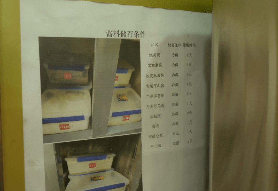 在拾味中点,不同的原材料有不同的储存方式和开封后保存时间,保质期12个月的棕油,开封后只能使用2天时间;需要冷藏的丹麦面包油、片状甜奶油和王牌酥片玛琪琳开封后只能当天使用。“我们门店所有的原材料都有严格的储存方式和使用期限,一点都不能马虎。”门店工作人员介绍,在拾味中点,很多酱料开封后的使用期限都是一两天时间,这样能保证糕点的出品质量,也能给顾客上佳的舌尖体验。