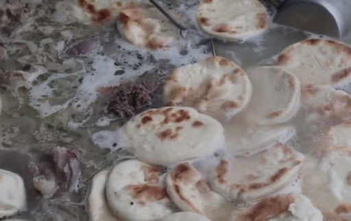 这家小摊卖的是羊肉汤来着,摊位上是一位大叔。跟大叔聊天的时候了解到,这小摊一天能够卖出去四五头羊,生意还是非常好的。可以看到在摊位旁的一大口汤,汤非常浓郁,而且里面除了羊肉,还有馍饼。