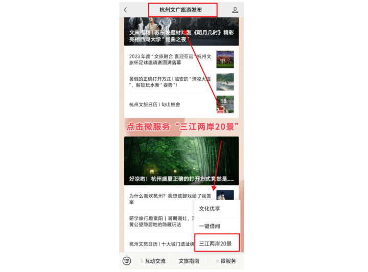 参与网友可关注“杭州文广旅游发布”微信公众号,点击“微服务”菜单栏“‘三江两岸’20景”按钮,进入景点评选及拟名征集主题页面选择景点投票,投票成功后可拟名报名。