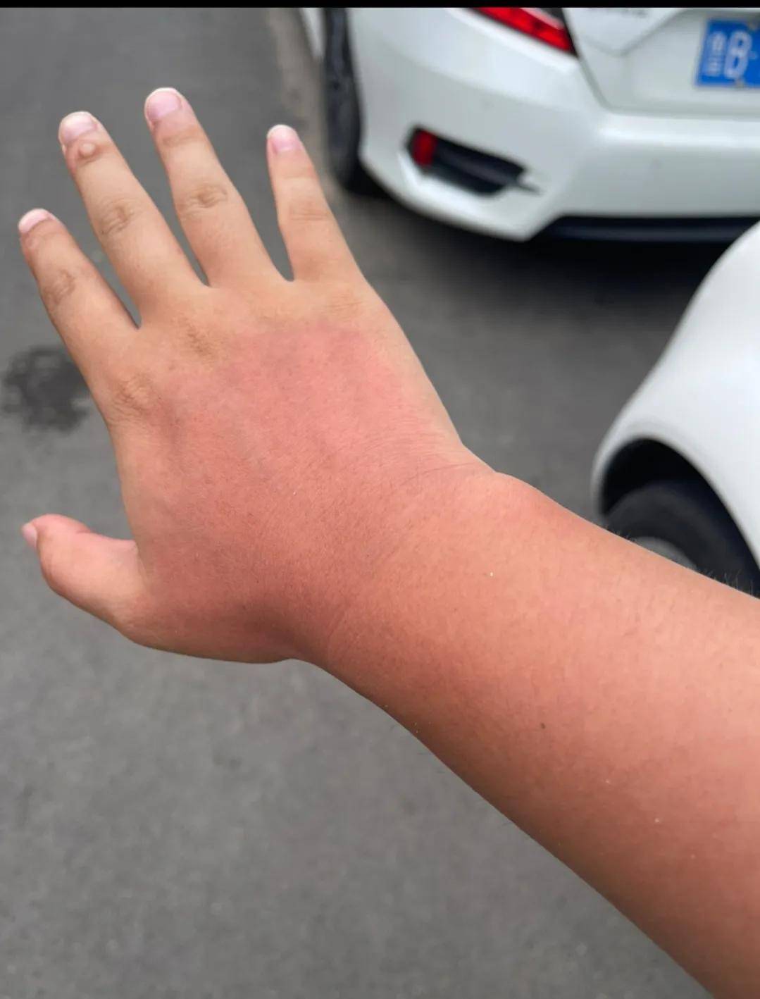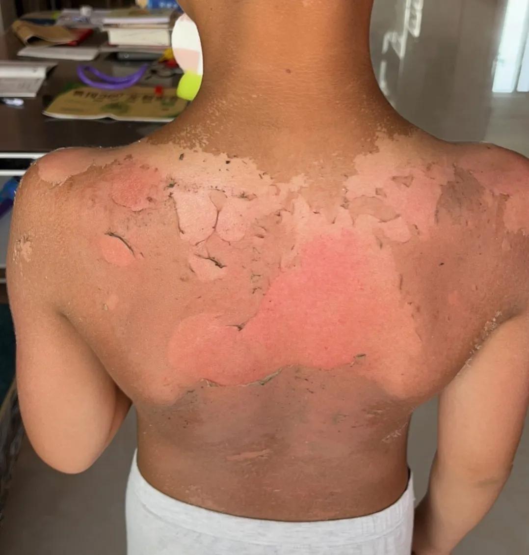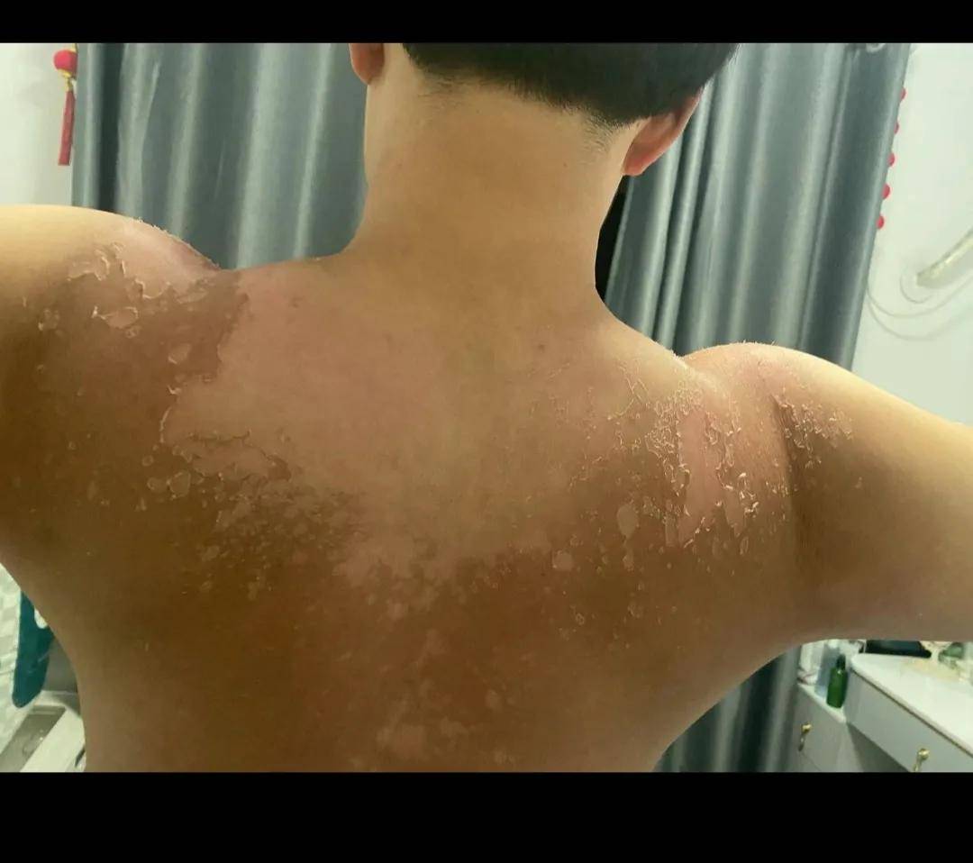 皮肤晒伤了,又红又痒,可遭罪了。
