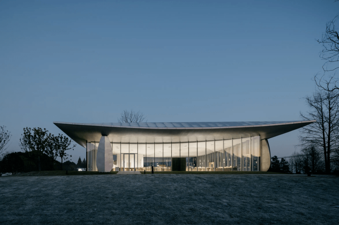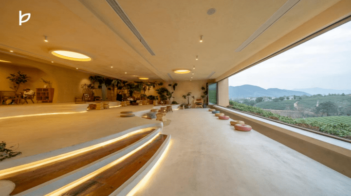 白茶客厅由国内著名建筑师柳亦春先生设计,其在 上海黄浦江边设计的“龙美术馆”、“八万吨筒仓 艺术中心”非常有名。白茶客厅延续了他的建筑思 想和风格,顺着原有高低起伏的地势修建,作为人 们来到白茶原的第一站,馆内展陈了安吉白茶的发 展流脉,能更好地了解安吉白茶及其制作工艺。