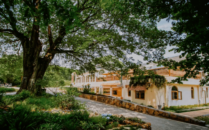 一座由林科所废弃宿舍楼改造而成的乡村商业综合 楼,集合了村民食堂(中餐)、窑烤面包房、西餐 厅、薪火日式料理、甜品屋、民宿等丰富的业态, 在这栋法式复古风的两层小楼里,不用走远就可以 解决住宿和吃饭问题。