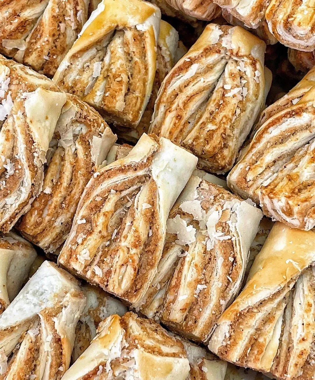 鸭尾酥外形如鸭尾,是老青岛人常吃的传统糕点,小时候每到过年,家里总会备上一些。每块鸭尾酥都叠加了几十层酥皮,每一层都薄如蝉翼。