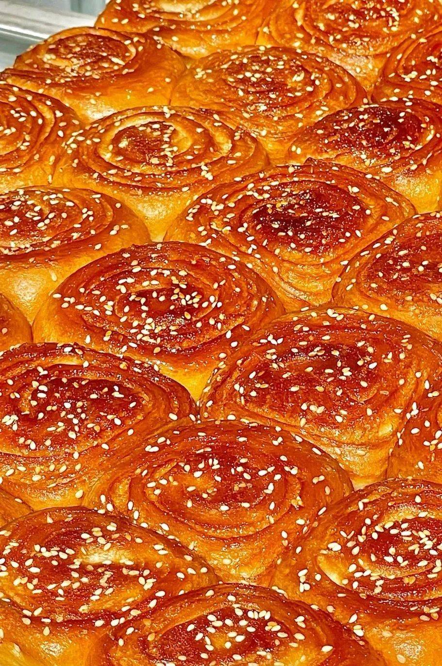 一盘小面包整整齐齐地码放着,上面一层金黄很是诱人,刷上蜂蜜,撒上芝麻,看着就让人食欲大开。
