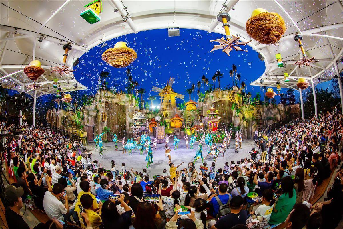 精彩的“奇幻夜光大巡游”也于晚间上演,大巡游以“奇幻之旅”为主题贯穿全程,演出时长超20分钟、演职人员近百人。拥有7大主题方队、10辆花车,熊猫侦探社、蜥蜴人军团、歌姬米娅、特工贝勒等园区原创IP人物均在花车上亮相。除了为游客奉上精彩的歌舞、杂技表演,各IP人物还会与游客一起亲密互动、合影留念,带来难忘的奇幻夜游体验。