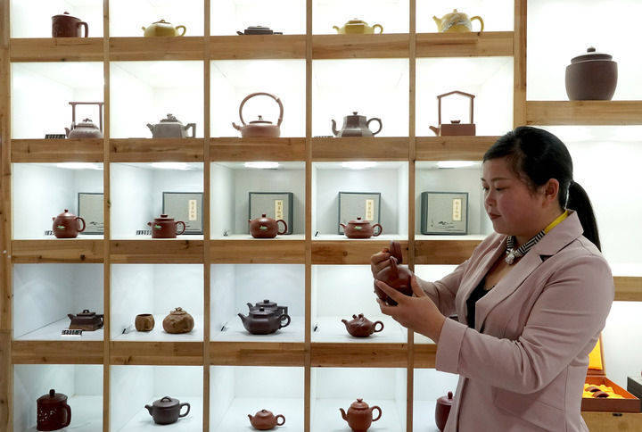 刘巧娟在陶瓷产品创新体验中心里查看产品(3月30日摄)。新华社记者 李安 摄