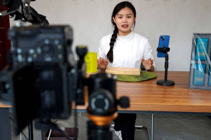 肖珺景在网络平台直播销售茶叶(3月29日摄)。新华社记者 李安 摄