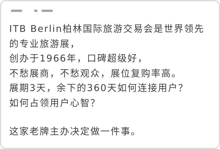 年轻人在关注什么?他们在什么时间用什么工具...于是,老牌的ITB Berlin柏林国际旅游交易会出手了。近日,主办方推出了