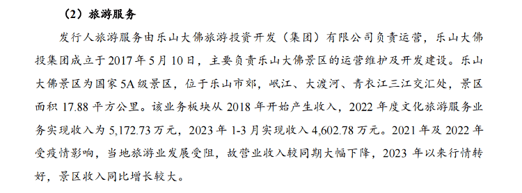 此外,《说明书》还提到,公司的旅游服务由乐山大佛旅游投资开发(集团)有限公司负责运营,主要负责乐山大佛景区的运营维护及开发建设。该业务板块从2018年开始产生收入,2022年度文化旅游服务业务实现收入为5172.73万元,2023年1-3月实现收入4602.78万元。2021年及2022年受疫情影响,当地旅游业发展受阻,故营业收入较同期大幅下降,2023年以来行情转好,景区收入同比增长较大。