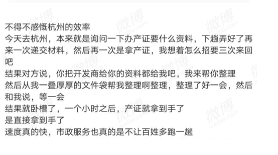 有微博大V曾分享过自己的经历——本来计划要三次来回跑才能拿到的产证,结果不到一个小时就到手了。
