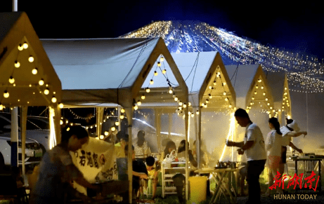夜幕降临,在茅竹镇三家村湘江河畔的露营烧烤基地,游客们围坐在一起喝茶、聊天、唱歌、吃烧烤;帐篷外,不少孩子们在草地上和儿童乐园里嬉笑玩耍。沿河小道上微风习习,三五成群的游客惬意地散步、拍照,不远处观光游艇载着游客们正在观赏沿江美景。