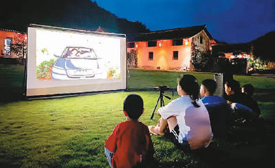 游客在陕西安康梦紫阳民宿观看草坪电影。资料图片