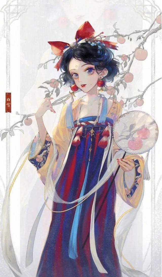 迪士尼第一位登场的童话公主白雪,她与七个小矮人的故事早已家喻户晓,大多数人印象中的白雪公主都是一位善良可爱的小女生,带点“婴儿肥”的脸上看不出任何岁月的痕迹。而穿上优雅的“中国风”汉服后,白雪公主的形象也变得更为靓丽,手持柿子图案的圆扇,面容清秀,身材娇小,散发着小家碧玉般的田园淑女风情,温婉得让人挪不开眼。