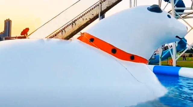 而作为游乐园,水上项目必不可少。这边有室外水上乐园,主体是一只呆萌的北极熊,规模很大,它身下一圈是泳池,于是看到熊在,小朋友们都要往上爬。先进入水池凉快下,然后顺着北极星身上的爬梯上去,上到熊的背上,再从尾巴处跳水,依次来回。这一个水上项目,集充气床与游泳于一体,创意性、娱乐性都不错。小朋友们从上面跳到下面,游着一圈水,像是活泼的精灵,乐此不疲。