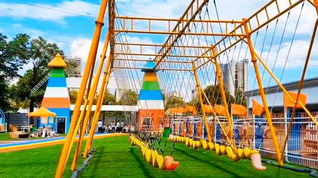 在滑草区域边上,还有摇晃秋千桥。这个项目是妥妥的集体运动,这一会儿,还没有多少人来,因此它是空载的状态。小朋友一个人过去走一圈,全程抓着防护绳,还要大朋友在一边牵引。于是这一趟行走小心翼翼,也紧张的慢慢挪步,看不到脚步的规律,只有防护绳子反复摇晃,看着马上要摔倒,但就是硬生生抓着绳子没有倒下去。在集体运动时,多人站在一起,激荡着护栏摇晃,带来头晕目眩的效果。