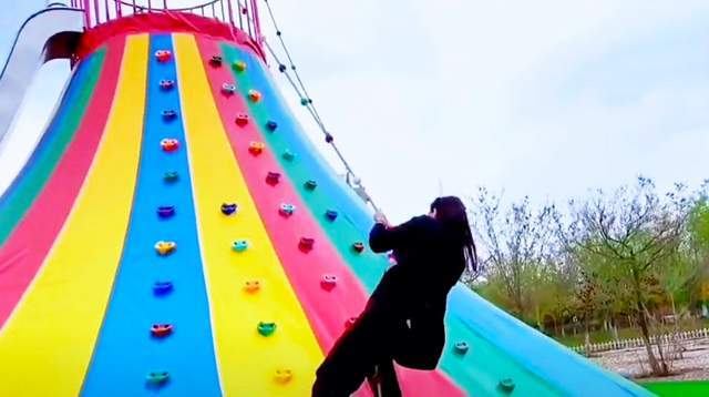 从脚底下摇晃的项目换到脚踏实地的项目,攀岩一定算得上是第一。欢悦谷亲子乐园里的攀岩,规模小很多,且只是象征性推出一座锥形的建筑,主体是斜坡,上面有脚蹬子的地方,攀岩的时候,有防护绳,也有支撑方向的主牵引绳。不过,即便如此,这个攀岩的过程也不那么顺利,徒手向上走,脚步十分扎实,需要很用力,手脚都要发力。最关键的是,这个攀登的高台面积又不大,还要人侧着身子上去,相当于增加了难度。