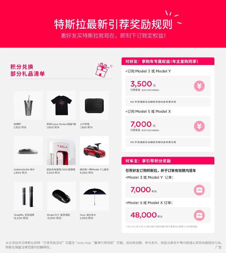 日前,特斯拉中国日前宣布,7月7日起,复购或通过好友引荐下订Model 3/Y并提车,购车人即可获得用于抵扣车辆尾款的3500元引荐奖励,同时还可享有增强版自动辅助驾驶功能(EAP)90天免费试用权。作为引荐人,倘若引荐好友成功提走Model 3/Y,也能获得7000积分,可兑换超级充电里程额度、Model Y儿童学步车等精选好物。除了Model 3/Y的最新政策外,特斯拉此前还上线了针对Model S/X车型的迄今力度最大的现车激励及引荐礼包。