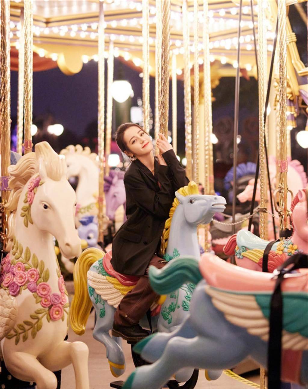 今迪丽热巴工作室公开了她夜访迪士尼的系列美照,梳着包包头的她,搭坐旋转木马,穿上了长版黑色西装外套,各种表情放送,玩得像个小孩,模样十分可爱。