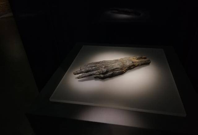这是一只埃及木乃伊的手,应该是一位成年男性的手,距今有5000年以上的历史,但看上去像个农村地区老头的手,手指处有点破损。