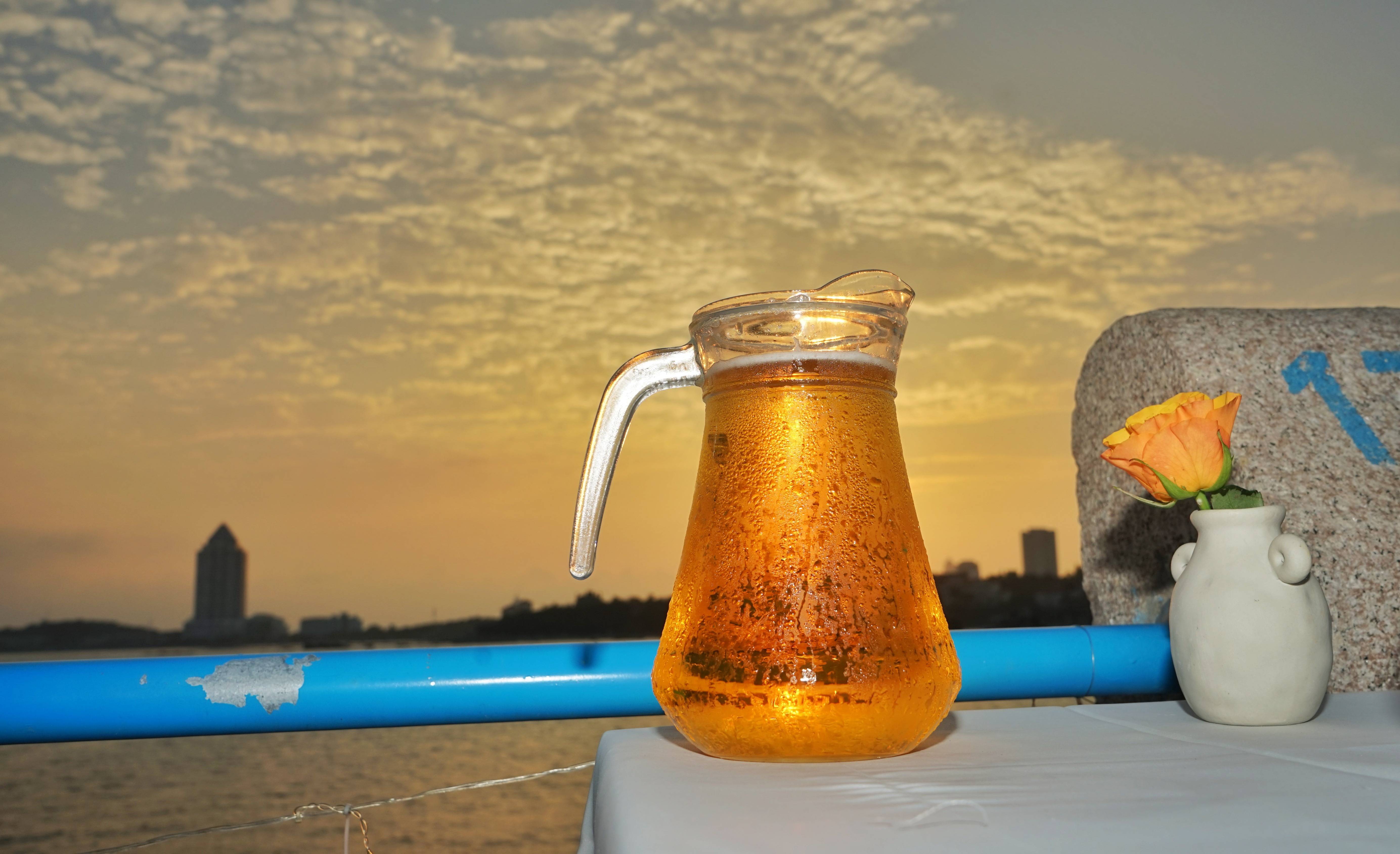 大海与啤酒是永不过时的绝配。泡沫涌起,像海面的潮起潮落。当落日晚霞出现,来市南喝一杯啤酒吧。