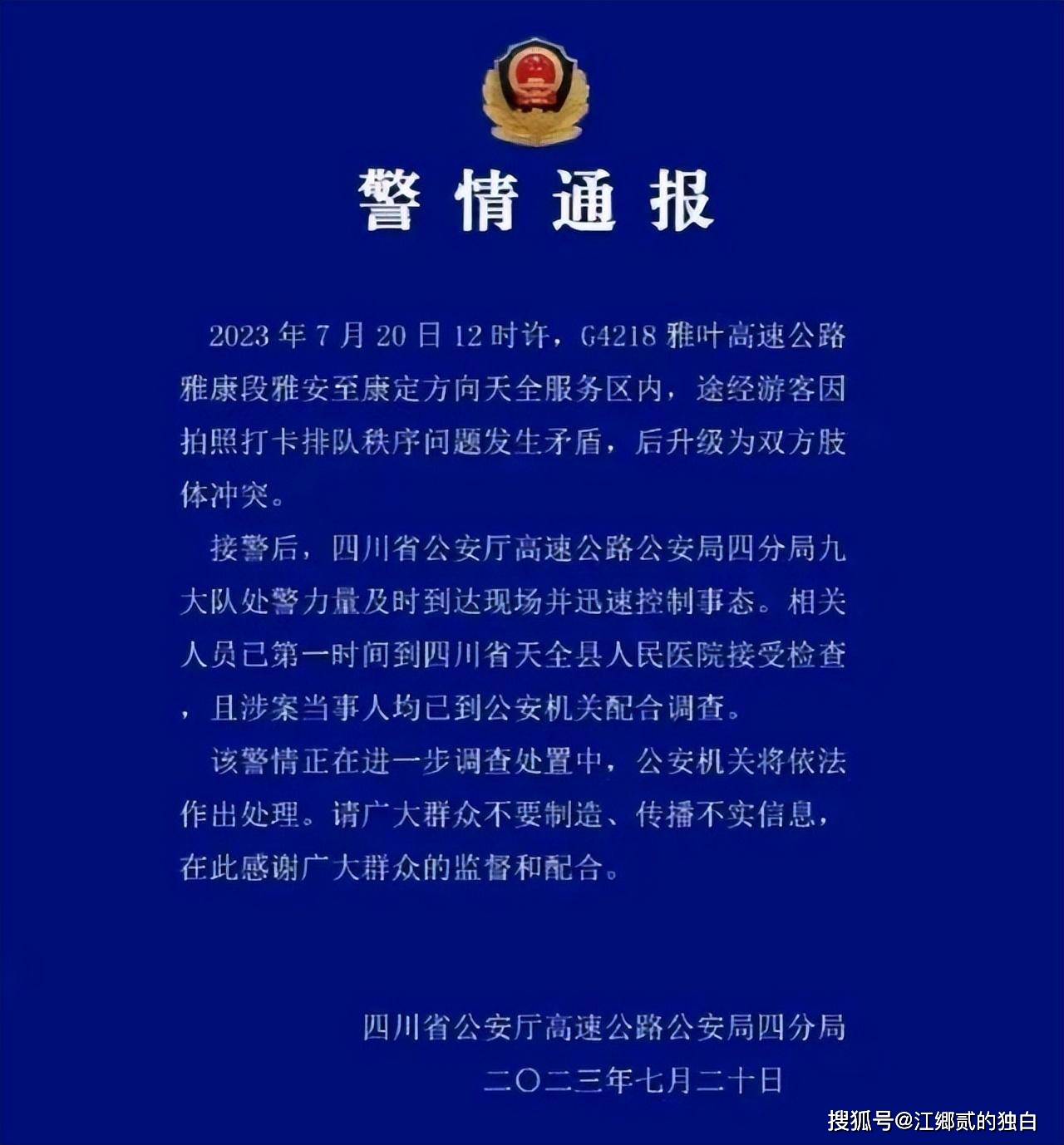 7月20日,多人在天全服务区发生纠纷,从口角纠纷上升到肢体纠纷,警方针对此事发布通报。