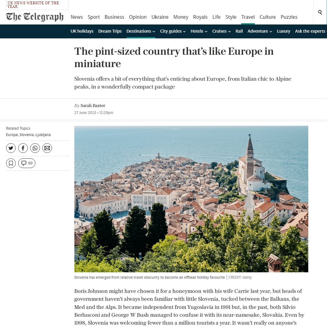 英国前首相鲍里斯•约翰逊和妻子在斯洛文尼亚的蜜月旅行引起了媒体的广泛关注,《每日电讯》(The Telegraph)将斯洛文尼亚介绍为“绿色蜜月之国”:一个可持续发展且令人放松的国家,非常适合浪漫体验。