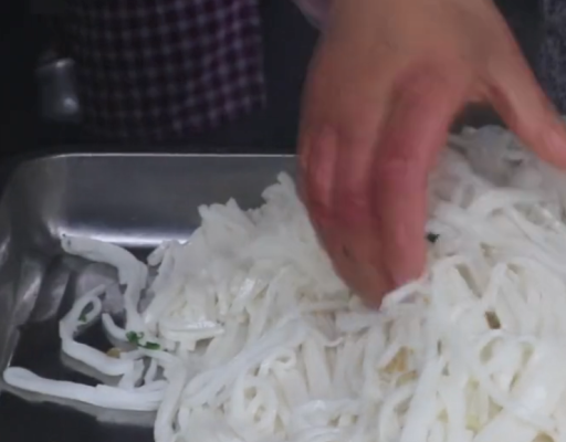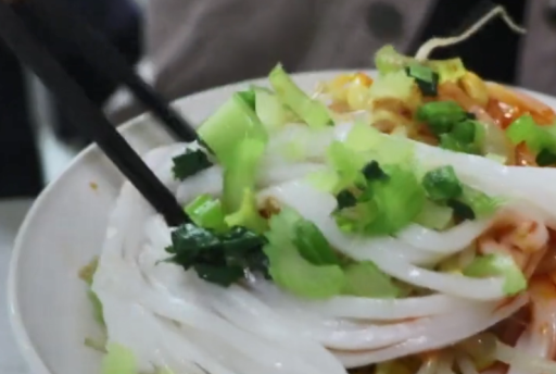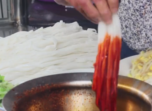 米皮顾名思义就是用大米做成的美食,经过磨浆、蒸制、切条而成的,看起来有点像广东的粿条,但口感会更劲道一些,米皮也比较薄哦。而陕西米皮一般都是用辣椒油、秘制调料水凉拌的,像这家店的老板都是抓一把米皮放在碗里,再加上黄豆芽、蒜汁、调料汁等。