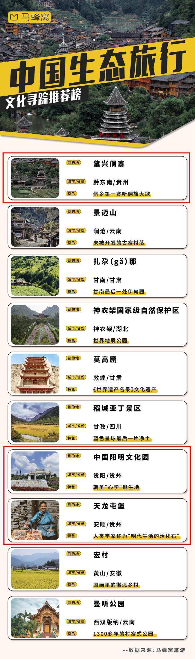 旅游消费观念的转变,让越来越多的年轻人开始重视并参与到以保护为核心的生态旅行中来。为了帮助更多人在旅行中深入当地生态及人文肌理,享受美景的同时保护生态环境,马蜂窝于近日发布“中国生态旅行推荐榜”,通过“避暑度假”“亲子研学”“宝藏秘境”“野奢露营地”“文化寻踪”“美食原产地”六大榜单,为游客奉上专业高效的生态旅行指南。其中,肇兴侗寨、中国阳明文化园、天龙屯堡入选文化寻踪推荐TOP10。
