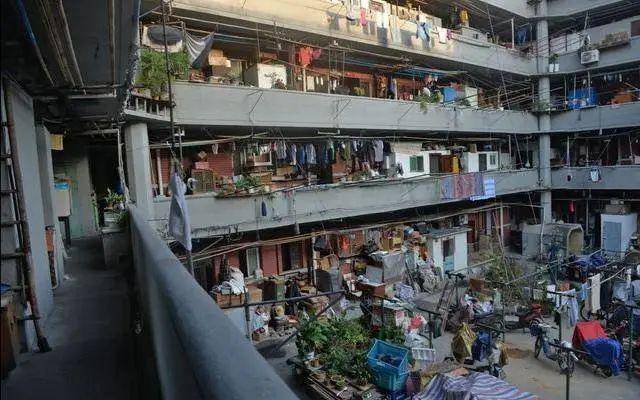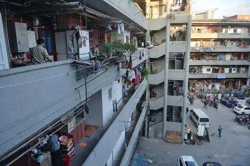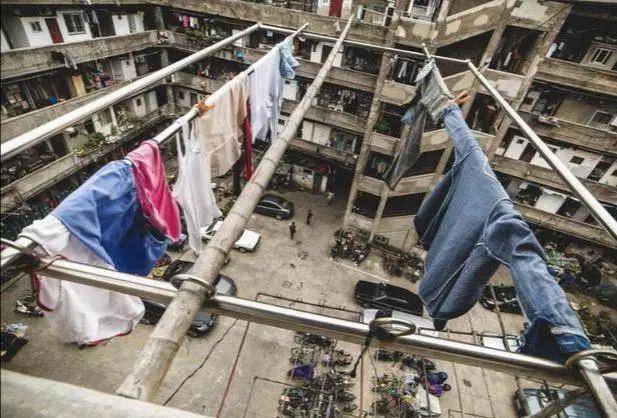 但在这座公寓的各个楼层中还穿插着一些竹竿,让原本看上去凌乱的公寓变得更加密密麻麻。这些竹竿不仅在各个楼层的阳台上,而且还有跨楼层穿插着,和很多电影里面生活气息十足的大院一个味道。