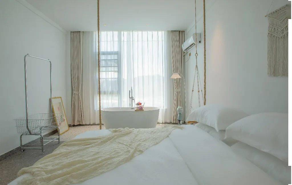 民宿共有14间客房,月初、新禧、岸芷、盛雪......每个房间,都有属于自己自己的名字。大面积的窗户,可以让视线可以落到远处乡野中。