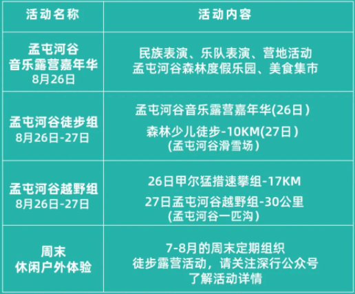 据悉,本次徒步露营节分为孟屯河谷音乐露营嘉年华、孟屯河谷徒步越野赛、周末休闲户外体验三大部分。