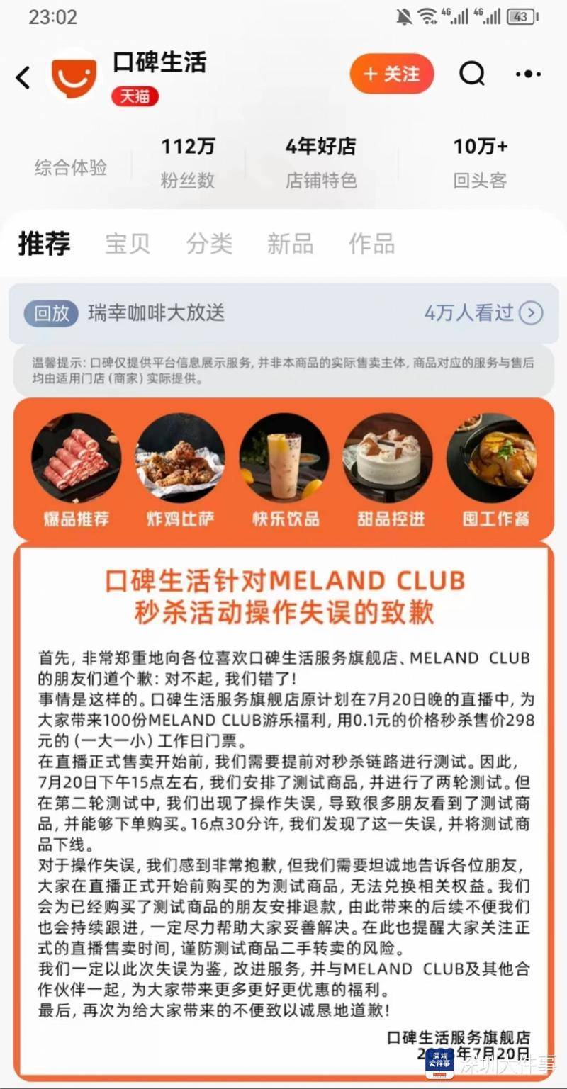随后,口碑生活服务旗舰店在店铺首页贴出致歉信,声称原计划在7月20日晚的直播间设置100份Meland club游乐福利,用0.1元的价格秒杀售价298元的(一大一小)工作日门票。提前对秒杀链路进行测试时,出现了操作失误,导致很多朋友看到了测试商品,并能够下单购买。