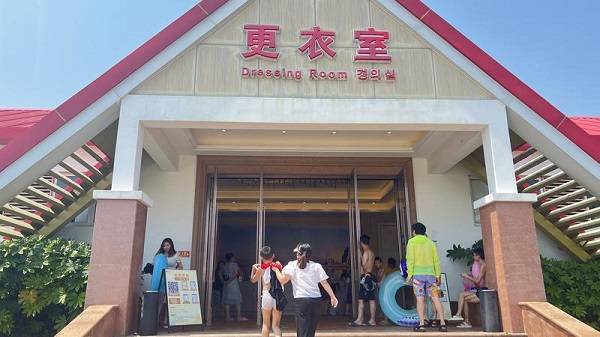 周先生介绍,景区有露天淋浴设施和室内淋浴设施。露天淋浴为脚踏板式,方便游客在玩水过程中就近简单冲洗,不过没有任何遮阳措施,顶着大太阳淋浴有点难受。室内淋浴在更衣室,和储物柜在一起。