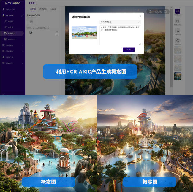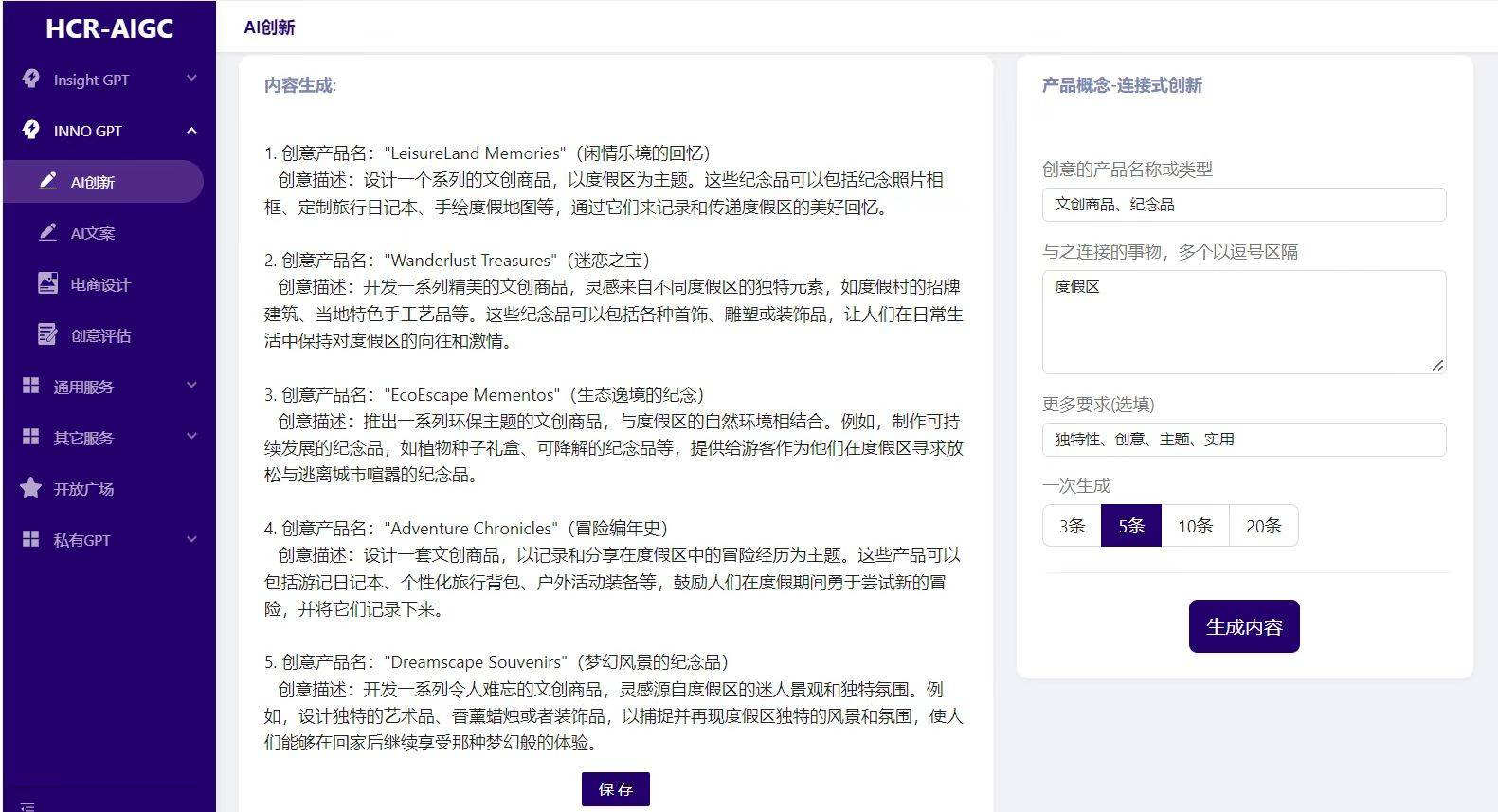 以本次研究报告为例,针对问题突出旅游度假区的商品创新,以及游客要求较高的水乐园沉浸式新场景打造,我们通过HCR-AIGC进行了创意概念的快速生成。将产品名称类型、与产品产生关联的事物和不同创新需求作为指令输入到HCR-AIGC产品中,几分钟内,产品便能够帮助生成多条创意,在灵感枯竭之时,快速获取产品创新思路。