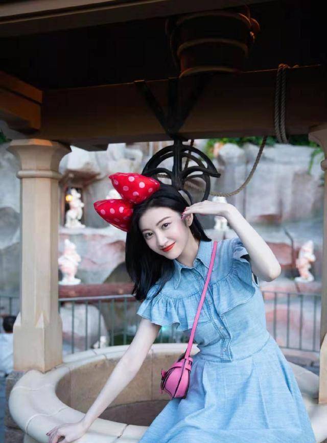 景甜的在白天的时候穿着一件蓝色的长裙,在景区的一处拍照留念,景甜肤色白,但是在和身后的建筑物对比的时候,景甜真的可以说得上是要白到发光了。景甜这一天完完全全融入到米妮这一角色,米妮的头饰似乎都没有摘下来过。