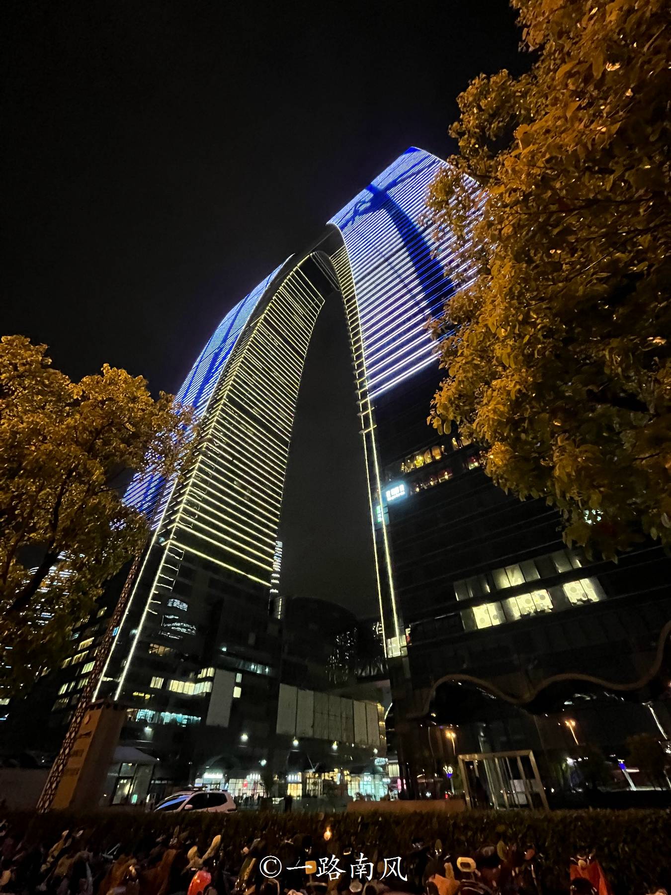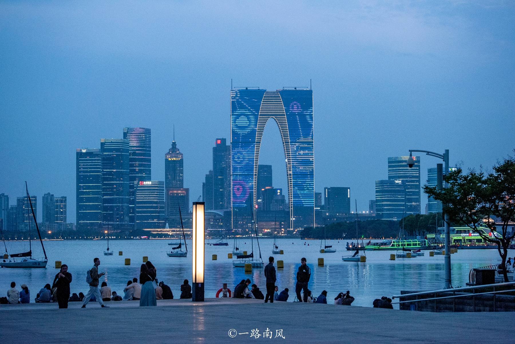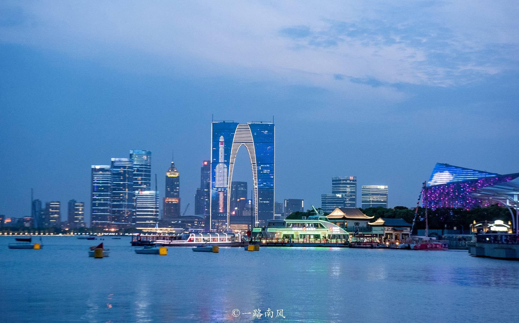 它就是苏州的地标建筑-东方之门,因为形状像大秋裤而得名,其实从远处看,颜值还挺高的,尤其是入夜后特别有大城摩登气象,和苏州市江苏第一城的气质相匹配。