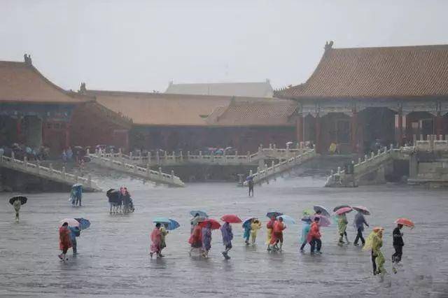 北京阵雨不断,但故宫地面积水很少。凭借较高的地势与精妙的排水系统,故宫避免了“看海”模式。