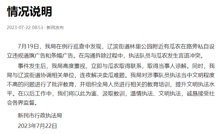 7月22日,辽宁沈阳新民市行政执法局发布情况说明: