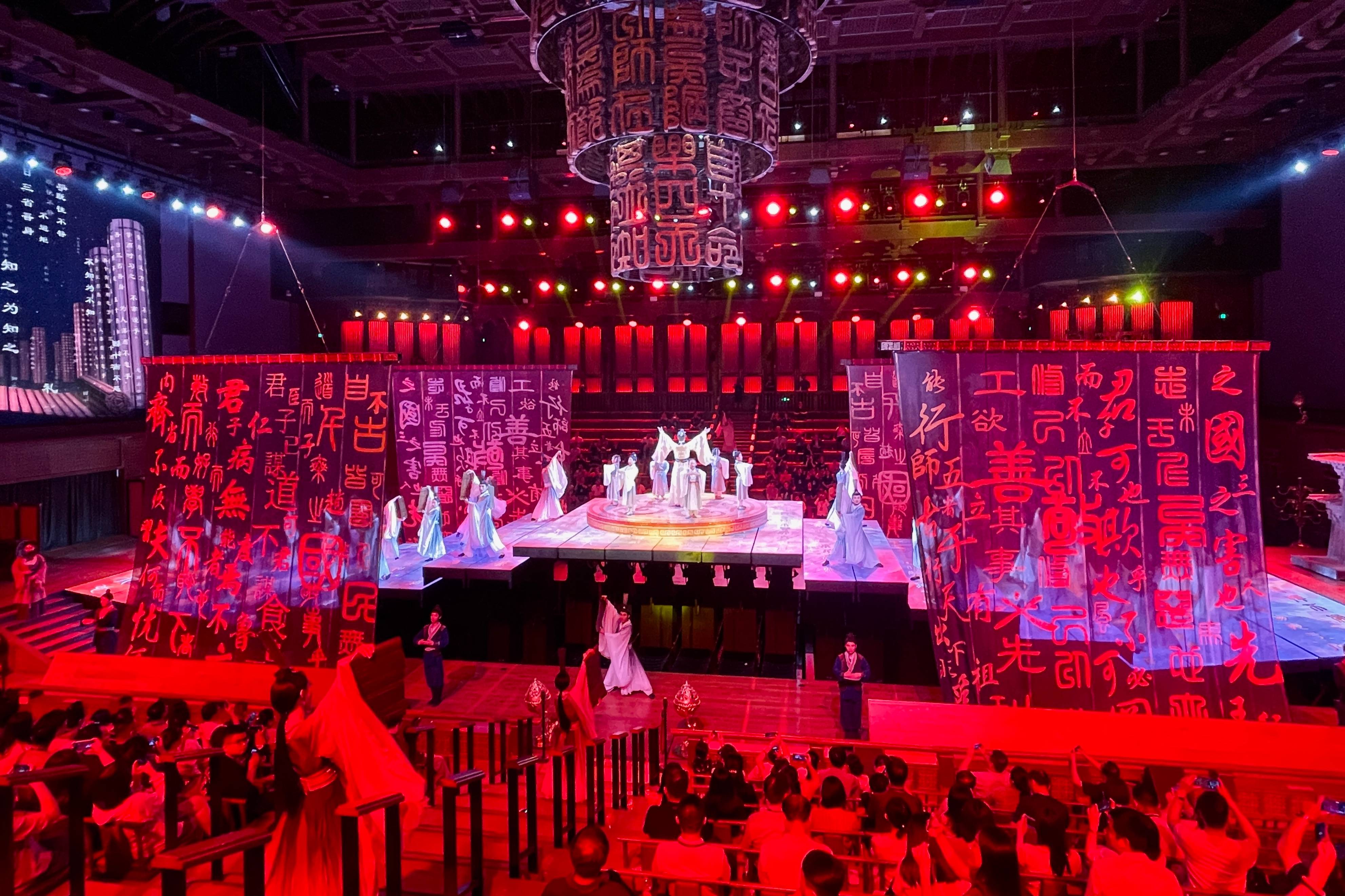 夜幕降临之后,尼山圣境更值得一看。孔子像被灯光照亮,数百盏孔明灯缓缓升起,还有烟花秀点亮夜空,一切显得绚丽多彩。在室内,舞台剧《金声玉振》在声光电等科技等加持下,生动地演绎了圣贤君子由凡入圣的过程,场面宏大而精彩,很值得推荐。