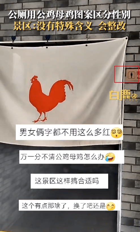 7月21日,据白鹿视频报道,近日,河北邯郸有游客发视频称一景区用公鸡和母鸡的图案区分男女厕,引发关注。