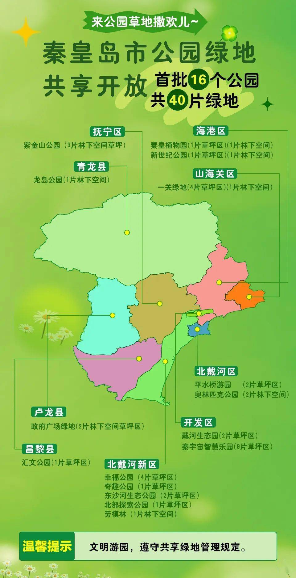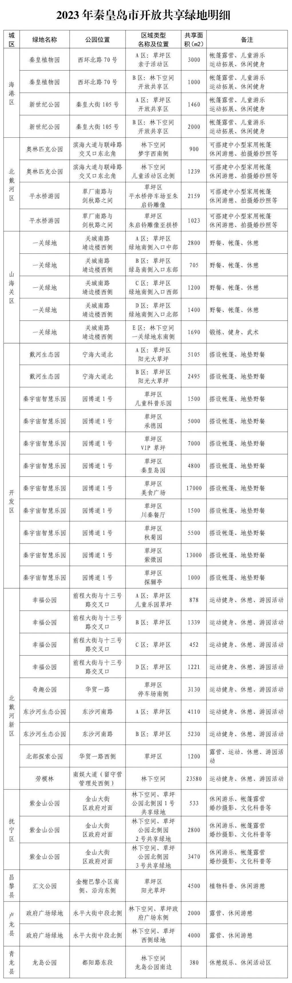 秦皇岛市首批开放40块绿地:海港区4处、山海关5处、北戴河4处、开发区11处、抚宁区3处、北戴河新区9处,昌黎县1处、卢龙县2处,青龙县1处,共享面积达14万余平方米。亲们可以大胆地进入这些绿地内,搭帐篷、野餐、休憩等。