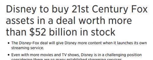 迪士尼拿下21世纪福克斯旗下的20世纪福斯影业、NatGeo、StarTv、Sky和Hulu的股份以及体育网络,交易总额超过520亿美元。