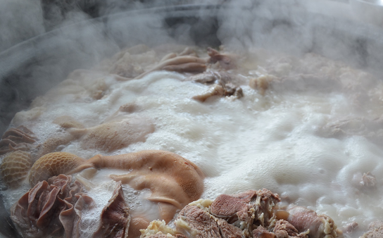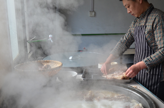大叔熬的一锅汤要熬制至少四个小时,在熬的过程中周师傅要不断地检查汤和肉的情况,熬汤的程序和时间虽然大体固定,但仍要考虑不同季节甚至天气对汤的影响,这些细微的把握无法靠钟表和温度计来控制。