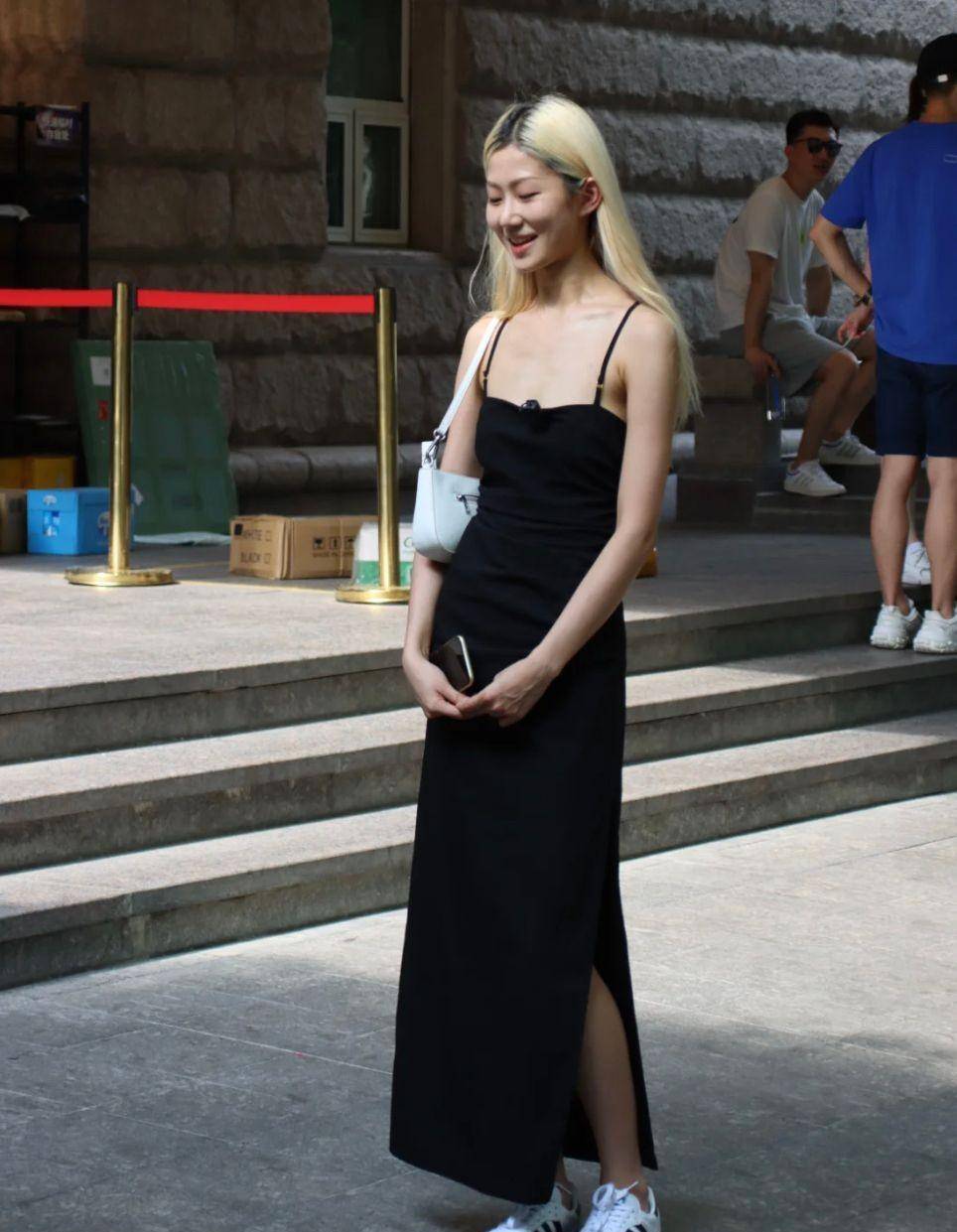 黑色的开衩连衣裙,款式简单大方,同时也让你看起来更显瘦。搭配一双小白鞋,不仅能提亮身材,还能给你额外的休闲时尚感。
